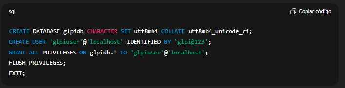 Depois crie o banco e o usuário para o GLPI